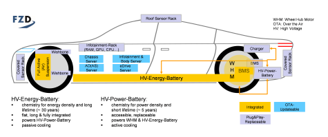 Our vision of a car which remains desirable and stable in value for at least one generation (Car 4 Generations) strives for the ultimate sustainability. The BEV-version of it has two batteries with completely different chemistries: one for energy, one for power. The later is small, can be replaced easily and protects the huge energy battery from stressful peaks. All AD/ADAS-sensors are integrated in modules which are plug&play replaceable. A fully active suspension protects the whole body from vibrations to increase longevity. Today’s low weight wheel hub motors do not restrict comfort and when placed at the rear-axle, provide package advantages especially with regard to the accessibility of the power-battery and the possible length of the energy-battery.